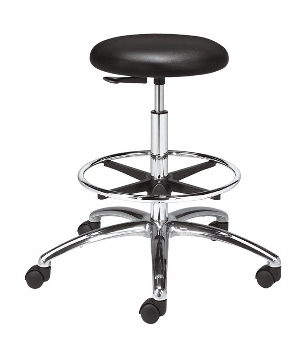 Stools are constructed of a sturdy, five-legged base in polished aluminum or chrome tubular steel. Easy-to-use pneumatic seat adjusts in height for variance in worker size. Adjustable foot ring measures 18'' in diameterset it for the most ergonomic sitting position. All models are black and include mushroom glides for stability. Order optional casters separately.