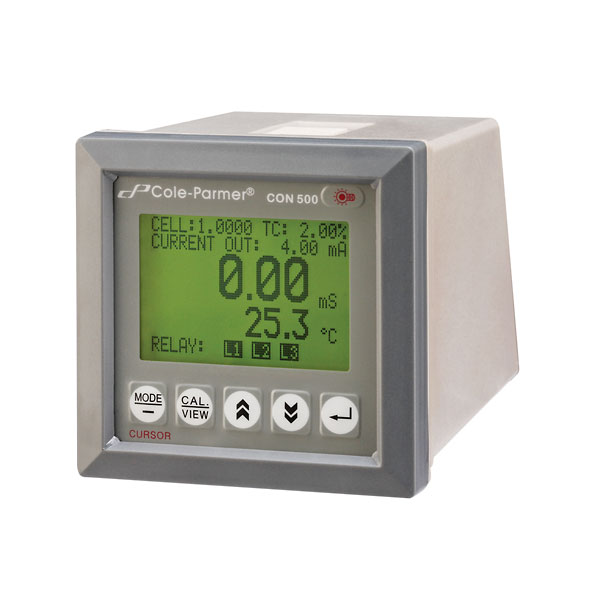 Cole-Parmer online controllers offer features found in more expensive models. Backlight, graphic LCD simultaneously displays measurement, temperature, cell constant, temperature coefficient, relay status, and transmitter current output. Calibration data is stored in memory; making the unit ready for measurement. User selectable cell constants, reference temperature and temperature coefficients; and automatic temperature compensation ensure measurement accuracy. Password protection, RS-485 for remote access, and the isolated and reversible 4 to 20 mA output offer extended data options with security.