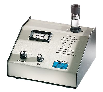 two primary and two secondary solutions for calibration (0.5 and 10 NTU), two sample cells, light shield, and 6-ft (1.8-m) cord with two-pronged AC adapter on 110 VAC models (European plug on 220 VAC models).