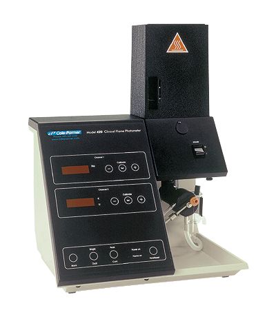 This digital unit offers improved analytical performance over single-channel flame photometers in the measurement of sodium, potassium, and lithium ions. Features include automatic ignition sequence, lithium internal standard, monitoring and control software, dual-channel display, and independent calibration of each channel. Built-in linearizing software allows sodium measurement up to 40 ppm.