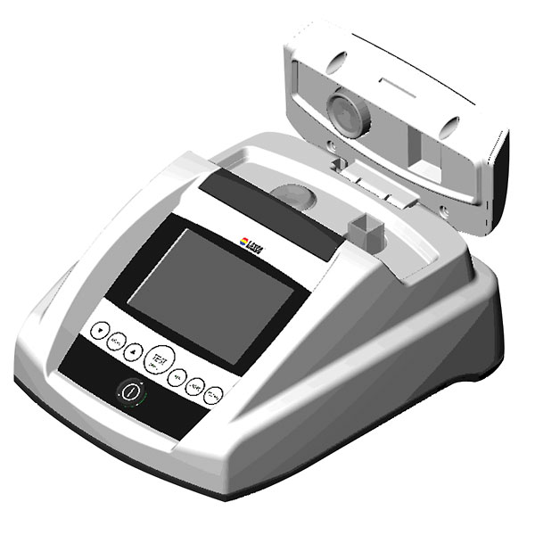 The 600 nm LED light focuses on the sample through fiber optic cables to obtain the readings quickly—no warm up time required. A simple touch panel provides eight separate functions and is easily wiped down in the event of spills. The fully recharged battery assembly provides 30 hours of operation; recharge time is 12 hours when the instrument is turned off.