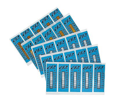 Labels are made up of a series of temperature-sensitive elements sealed between heat-resistant substrates with transparent windows. Each element changes color distinctly as its rated temperature is met or exceeded. The changes to the label are irreversible, providing a temperature history of the surface being monitored. The labels will not delaminate when removed, allowing them to be attached to an inspection report to serve as a permanent record. Ideal for use in the food, automotive, molding and metal working industries. Accuracy is ±1.8°F below 212°F and ±1°F above 212°F. Shelf life: 1 year after date of purchase.