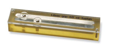 Meander Fusion Chamber 02894-50 is a microslide with a novel design specifically used for electro cell fusion. This chamber is constructed of a conductive metal alloy, which has been deposited in a finger-like projection array on a glass microscope slide. It generates an inhomogenous field and is used for cell fusion of microorganisms, plant, fungi, yeast and mammalian cells.