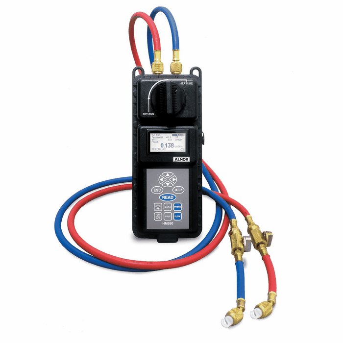Provides flow and BTU/hr calculations. Measure and display differential, high side, and low side pressures simultaneously without having to change hose connections or instrument valve settings. Operates on four alkaline or NiMH rechargeable batteries.HM670 kit includes: Hard carrying case, two 6.7 ft x 1⁄4 in hoses with shut-off valves, two B&G probes, two P/T gauge adapter probes, power cord, and four AA NiMH batteries.