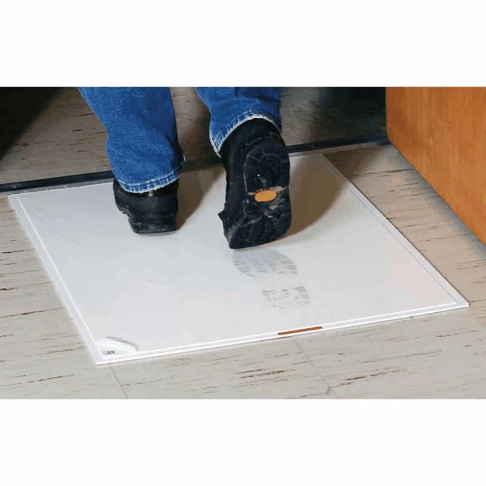 Entrance mat system is designed to remove dust, dirt, and other particulate from worker's shoes, carts, and dollies before being tracked into labs or office space. Mats are available in 30 or 60 layer versions and in white or blue. Each layer of the mat is fully coated with a particle-grabbing adhesive and an antimicrobial agent, and is constructed of 1.8-mil (50-micron) low-density polyethylene film. A printed number in the corner of each sheet indicates how many layers remain, and ensures at least one layer remains before replacement. Frames are all white and feature a polyester web-lock pad on the bottom to prevent it from slipping or sliding; simply replace with refill mats when needed.