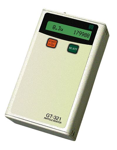 Handheld particle monitor features five size ranges that can be selected from the front panel. Monitor detects 0.3 ìm or greater sized particles at concentrations from 0 to 3,000,000 particles per cubic foot. The built-in rate counter provides a series of six-second count periods, each period is extrapolated to provide a concentration per sample volume. Results are shown on the 16-character LCD.