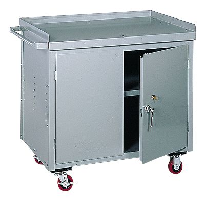 Cabinet has easy-rolling 3 1/2" casters that let you move this cabinet where you need it. Casters nearest to handle swivel for maneuverability and lock for stability. Top has 2" high edges to prevent items rolling off. Cabinet features 12 sq ft of internal storage space. Adjust center shelf height in 1 1/2" intervals. Built-in lock adds security. Gray finish.