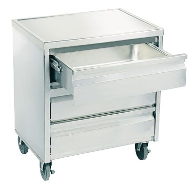 Fit this cabinet under table for more storage space. The cabinet includes three 20" x 15" drawers and 5" casters with brakes. The top of the cabinet has a countertop edge to prevent spills from dripping.