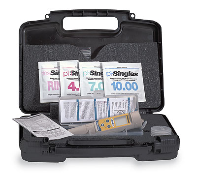 Meter kit adds: two single-use pouches of pH 4.01, pH 7.00, pH 10.0 buffer, and rinse solution, one sample jar, and sturdy carrying case.
