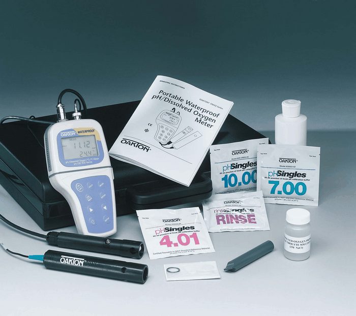 Meter kits further add: pH buffer calibration solutions, replacement membrane cap, rinse bottle, and case.