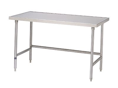 Stainless steel construction resists rust, ensuring a clean work surface for the life of these tables. Choose from two styles. Flat-topped, bullnose models offer quick, easy cleaning and feature an adjustable stainless steel (SS) undershelf for storage. Raised counter-top-edged tables protect floor by confing spills to tabletop; open base provides unobstructed leg room.