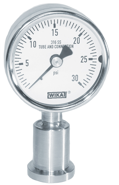 Gauges all-welded assembly contains an external flush diaphragm and is ideal for applications in the food, beverage, pharmaceutical, and biotechnology industries. Gauges are constructed of 316 stainless steel and have a 3/4" Tri-Clamp® process connection welded to the gauge. Assembly meets the criteria set forth by 3A standards. Gauge case and ring are 304 stainless steel and has a polycarbonate window.