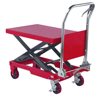 Foot pump operated scissor lift tables allow easy transport of heavy materials without bending—helps to prevent back injuries. Raise and lower the scissor lift by pushing down on the foot pedal. Dual braking system on each unit provides additional stability. Polyurethane fixed and swivel wheels make the table easy to maneuver. Scissor lift table also functions as an adjustable-height workstation.