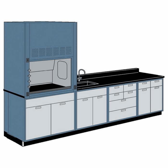 feature four cabinets complete with sink and constant volume/bypass fume hood. Fume hood is 48" wide and includes four remote control service fixtures and a cup sink. Fume hood requires blower and ductwork, order blowers separately. Black epoxy resin sink includes a deck-mount faucet, sink hangers, and plastic P-trap.