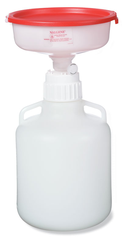 System includes a waste bottle and funnel that screws onto bottle opening for quick disposal. The hinged lid on the funnel is sealed to protect against dangerous vapors; long funnel stem helps minimize evaporation.Model 81400-14 is made of fluorinated HDPE for even greater chemical resistance.