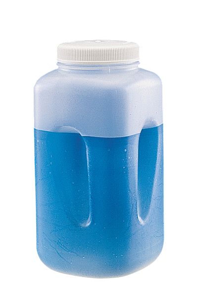 Molded-in handgrips provide convenience and safety. Suitable for solid chemicals and specimens. HDPE model is leakproof; PP model is autoclavable. Both models include a 100-mm polypropylene screw closure. Nalgene