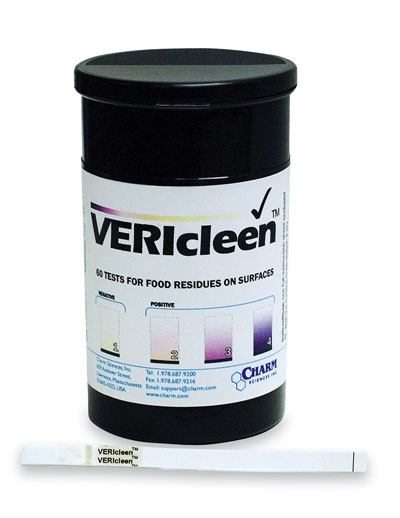 VERIcleen is sensitive to food residues including meat, dairy, bakery, beverages, eggs, fish, etc. It is an inexpensive rapid hygiene program to the food service, retail and institutional industries. Applications include HACCP programs, hand washing hygiene compliance, and overall sanitation monitoring.