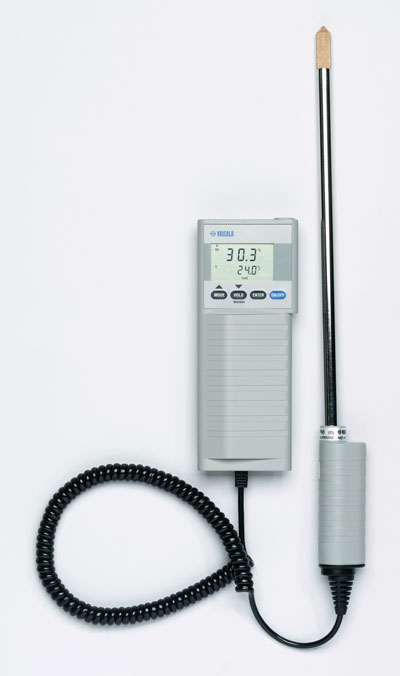 Units measure relative humidity and temperature; calculate dew point, wet bulb, absolute humidity, and mixing ratios. Models are available with integral or high-temperature probes; high-temperature probes include 5-ft cable. Model 03334-96 can be used in temperatures up to 356°F (180°C). Meters are constructed of ABS plastic, rated IP65 against dust and sprayed water.